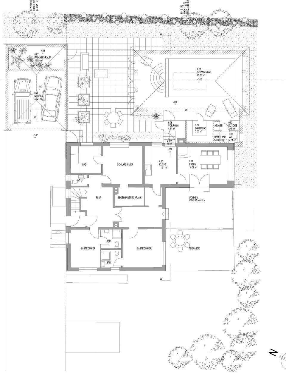 Die Planung erfolgte in 2 Varianten als Flachdach- und Walmdachlösung. Im rückwärtigen Grundstücksbereich bildet die neue Schwimmhalle einen Innenhof in Kombination mit einer neuen Garage/Orangerie.